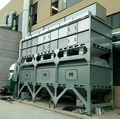 在化學反應(yīng)過程中,利用催化劑降低燃燒溫度,加速有毒有害氣體完全氧化的方法,叫做催化燃燒法。由于催化劑的載體是由多孔材料制作的,具有較大的比表面積和合適的孔徑,當加熱到300~450℃的有機氣體通過催化層時,氧和有機氣體被吸附在多孔材料表層的催化劑上,增加了氧和有機氣體接觸碰撞的機會,提高了活性,使有機氣體與氧產(chǎn)生劇烈的化學反應(yīng)而生成CO2和H2O,同時產(chǎn)生熱量,從而使得有機氣體變成無毒無害氣體。